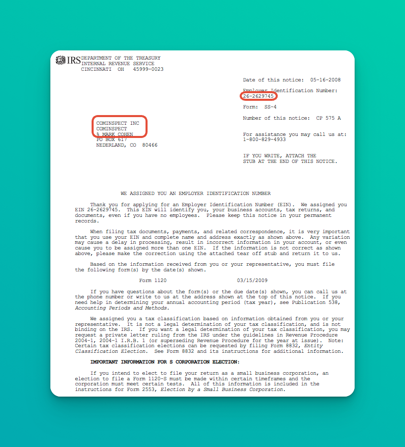 If you do not have access to your company's CP 575 notice then contact your company's accountant or financing office and ask for it. If the CP 575 notice has been misplaced, you may request a 147c letter from the IRS and use the information there for registration.