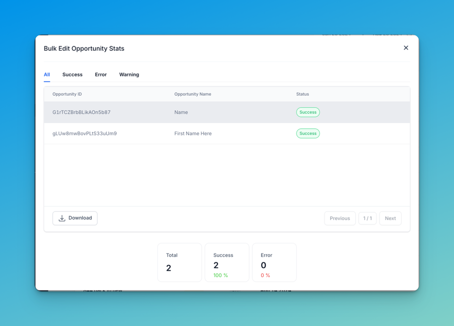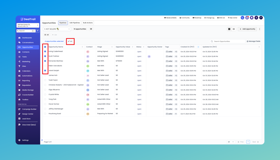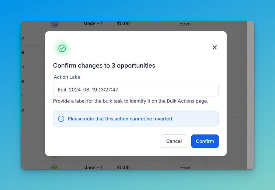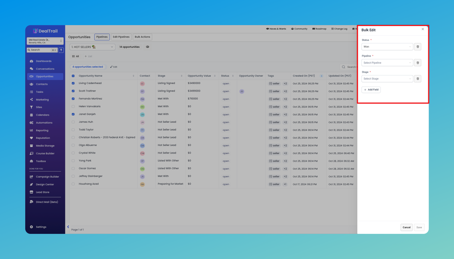 Bulk Edit Opportunities feature is designed to streamline your workflow by allowing you to update multiple fields across multiple opportunities simultaneously.