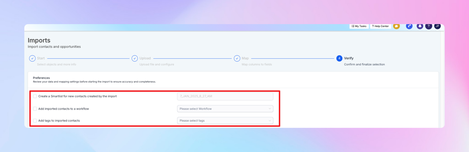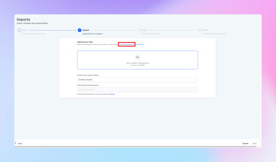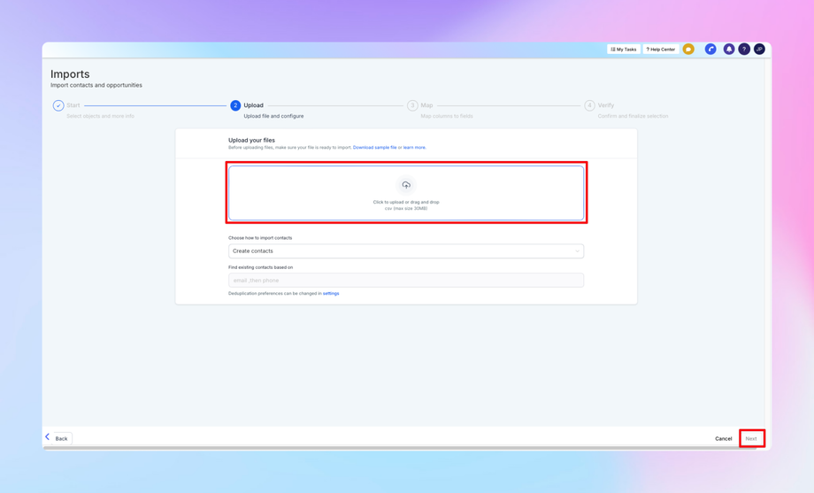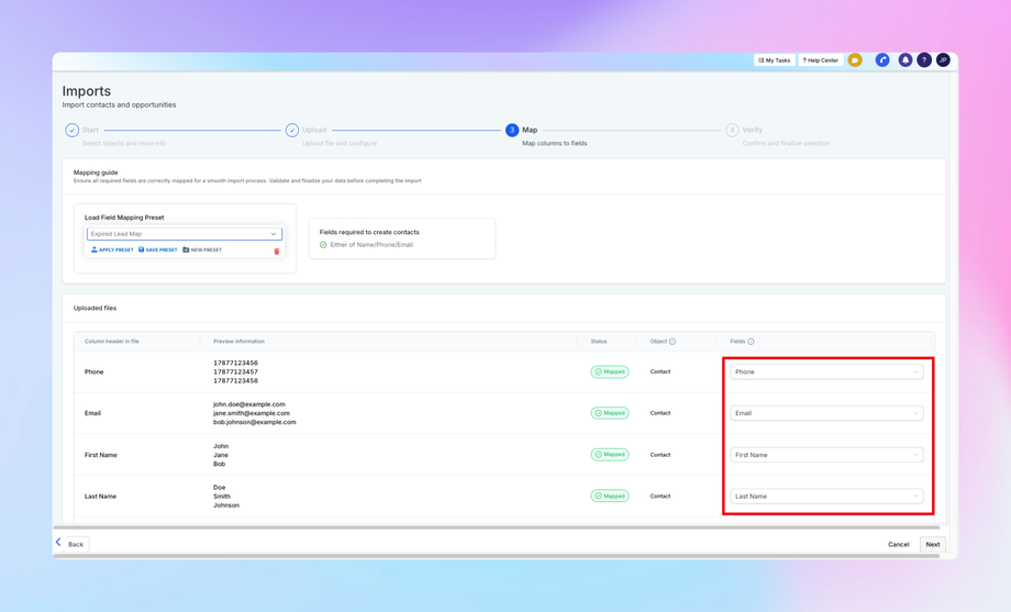 This means that it will create new contacts, and if you have any leads already in the system, it will update them with the information from your CSV file. The system will check for existing contacts in the sub-account based on the unique identifier (Email, phone, or contact id) you selected (Primary or Secondary preference). - Add New Contact Records: