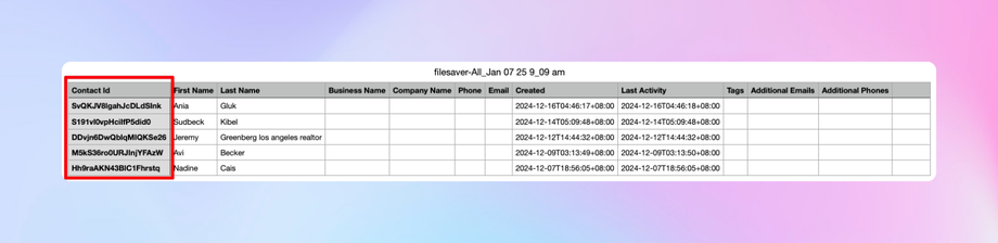 - Contact ID unique identifier only shows up if you have a column header with Contact ID written as the header title.