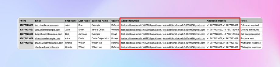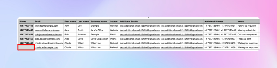 - If the email/phone column in the CSV is blank, but the additional email/phone column has values, the first additional email will serve as the primary email.