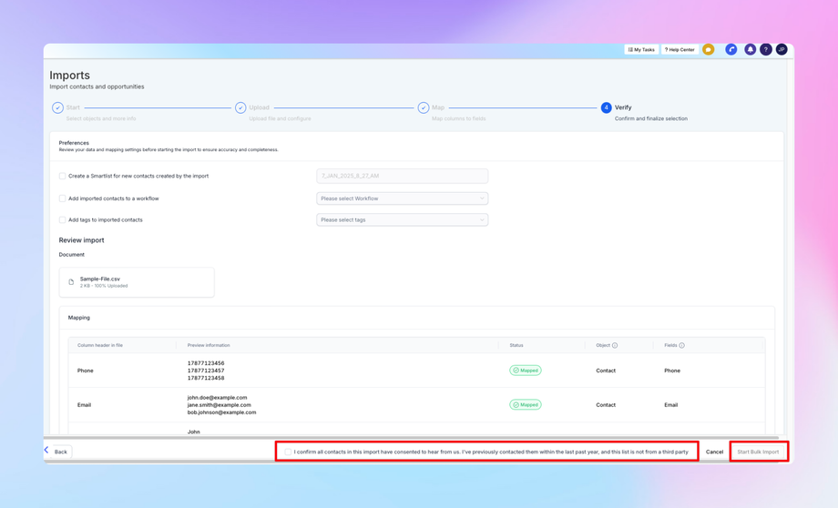 Verify that the contacts to be uploaded have consent to hear from the business and Start on Bulk Importing