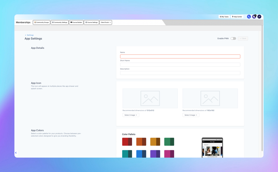 The Branded Mobile App allows you to offer a mobile-friendly experience to your members, providing access to courses, community groups, and progress tracking directly from their phones. If you’ve purchased the White Label Mobile App, this section allows you to customize the app with your branding.