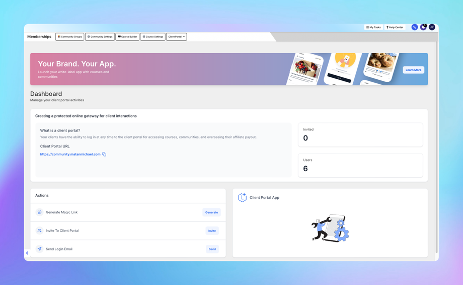 The Client Portal in DealTrail is a centralized space where your clients or members can access courses, community groups, and resources. It provides a professional, branded environment for managing their learning journey or accessing services.