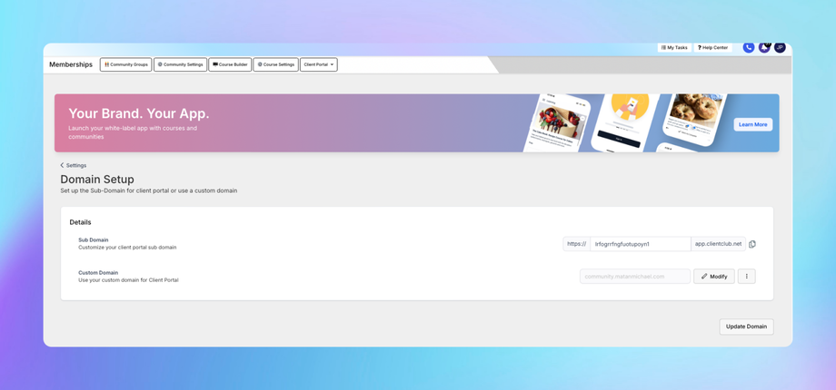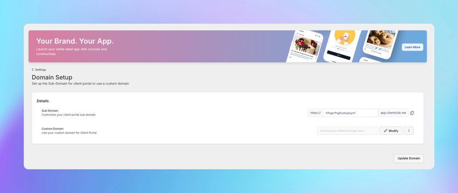 The Domain Setup section allows you to connect a custom domain to your course portal, ensuring a professional and branded experience.