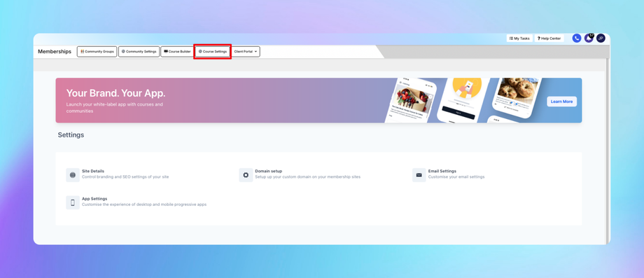 • Go to Sites > Memberships > Course Settings > App Settings.