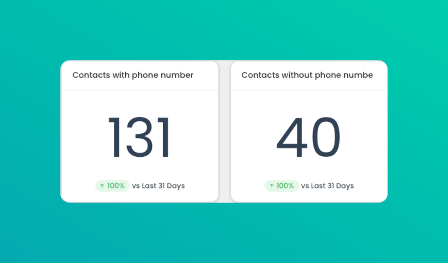 Displays the count of contacts that include a phone number and those that do not. Useful for understanding the availability of phone contact information, which is critical for SMS marketing, calling campaigns, or support.