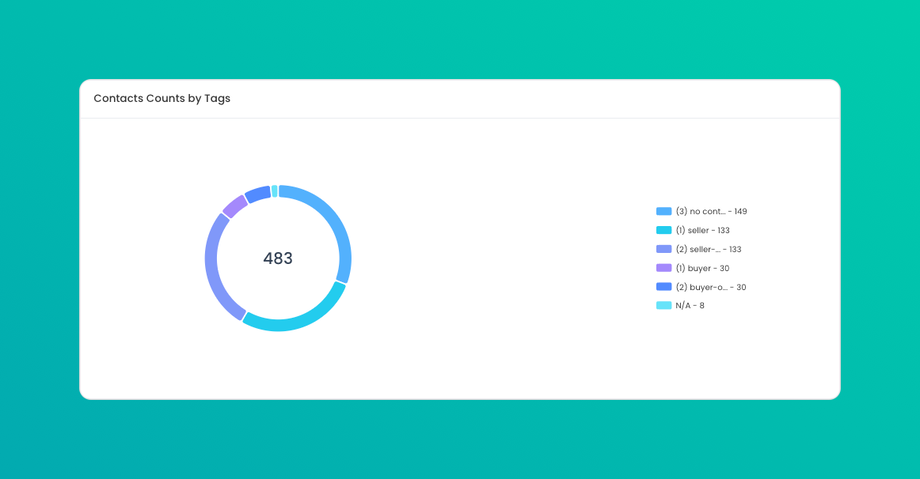 Displays the number of contacts segmented by tags, which can include categories like “Buyer”, “Seller”, “Lead,” or custom tags based on your business needs. Helps you organize and target your contacts more effectively, allowing for segmented analysis and outreach.