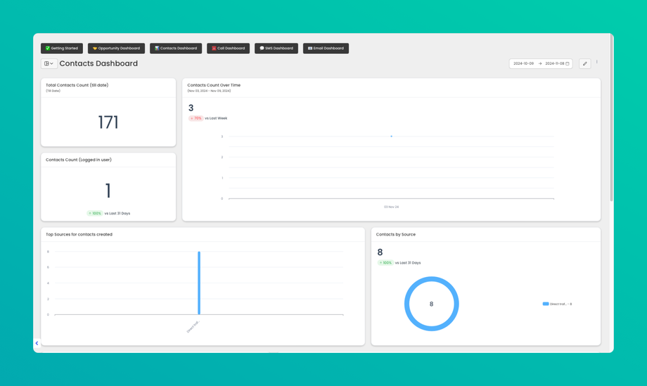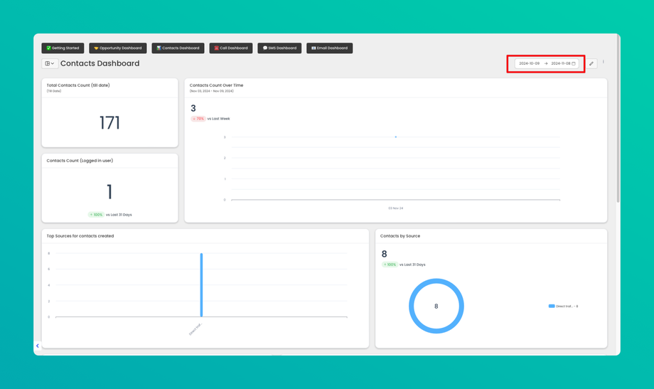 • Yes, use the date filters at the top of the dashboard to view contacts over a specified time period.