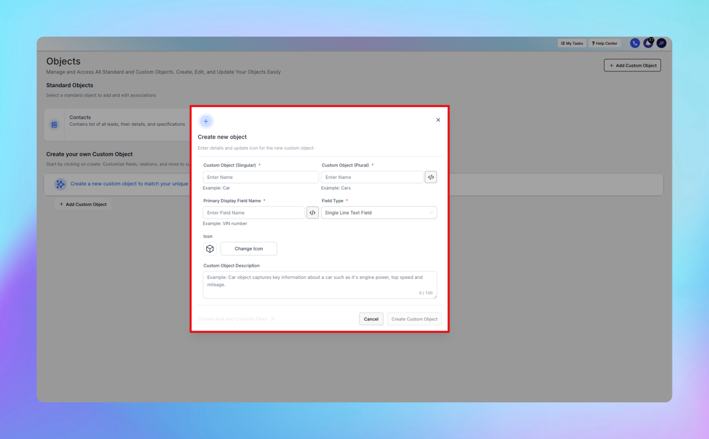 Internal Name of the object and the primary field is created by default - it can be edited by clicking on the "</>" icon and updating the internal name.