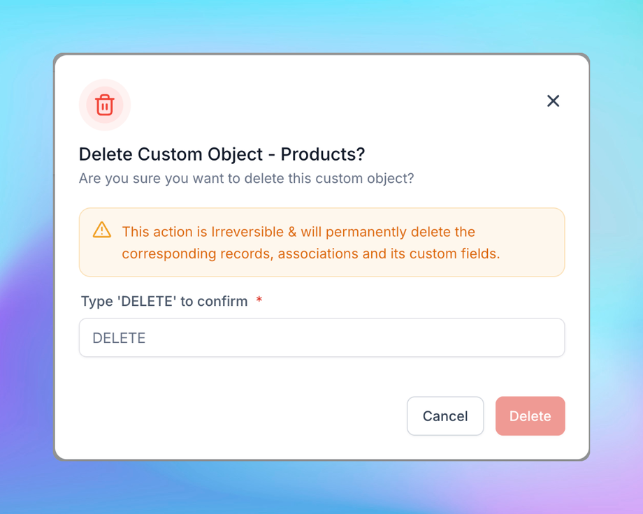 Note: Deleting a custom object is an irreversible action. Once a custom object is deleted, all its records, associations, workflows and custom fields will be deleted and cannot be recovered anymore.