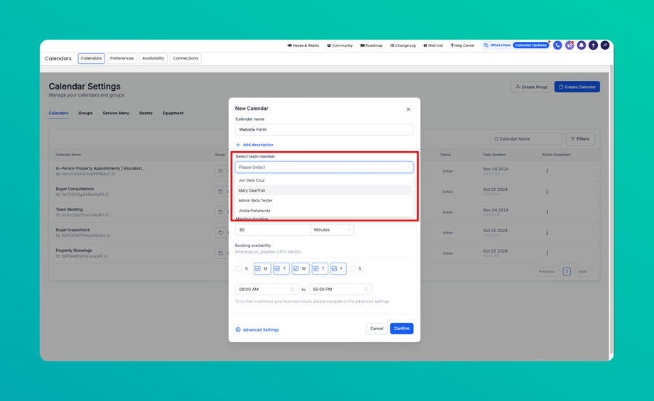 Click on "+ New Calendar" > "Select Team Member" > "Confirm"