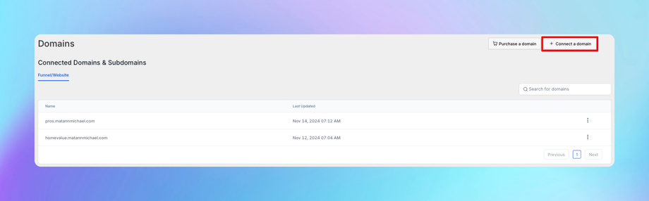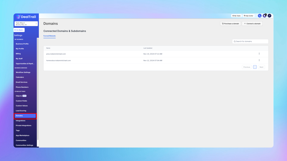 The Domain settings in DealTrail enable you to connect and manage custom domains for your funnels and websites, ensuring professional branding and accessibility for your audience. This guide explains how to configure and manage domains for your funnels and websites.