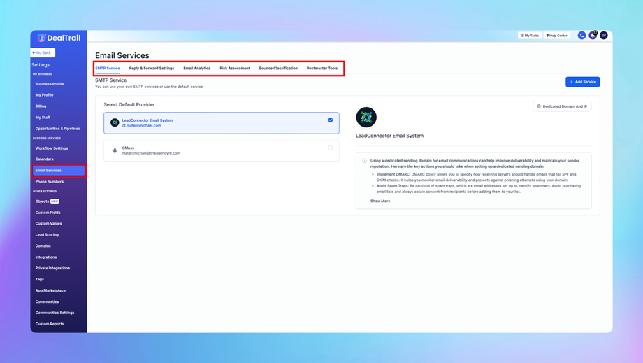 This guide provides a comprehensive overview of Email Services under Settings in DealTrail, specifically focusing on:
