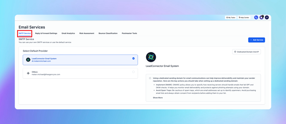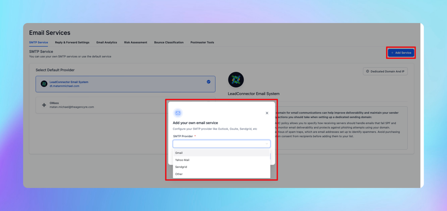 • Click Add SMTP Service and choose your preferred provider (e.g., Gmail, Outlook, or a custom SMTP).