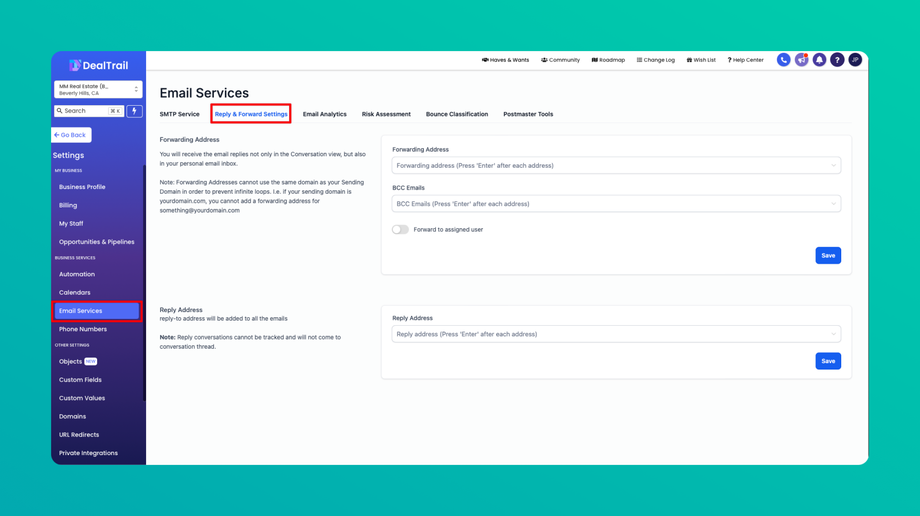 A: The forward settings in the email services tab do not support forwarding attachments. So if the contact replies to the emails with an attachment, we will need to log in to the DealTrail conversation view to see it.
