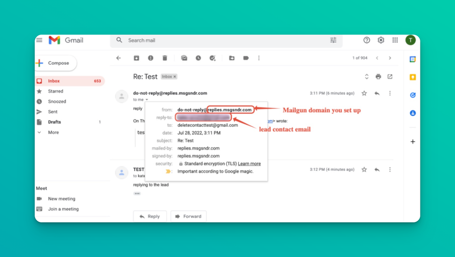 If you mask the sender email like testing@gmail.com, the reply-to address will show as testing@replies.subdomain.com, which is the Mailgun subdomain we set up for the location in Agency Settings-> Mailgun.