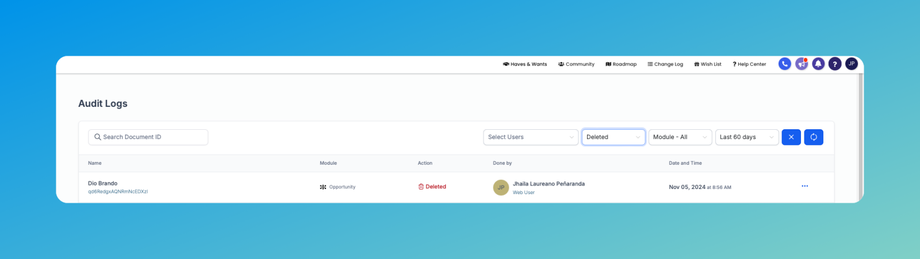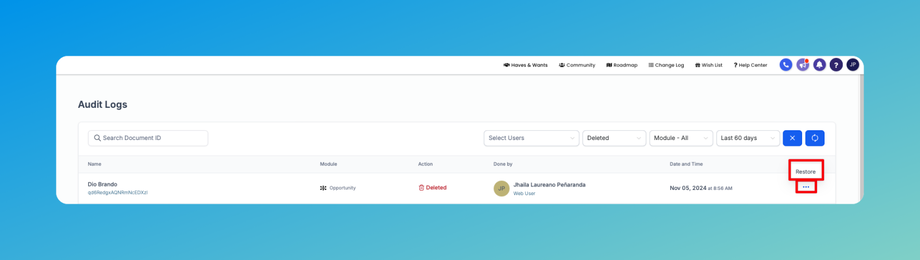 Alternatively, Click on "Restore Opportunities" through the Kebab menu in the top right of Opportunities page. It will redirect you to the Audit Logs.