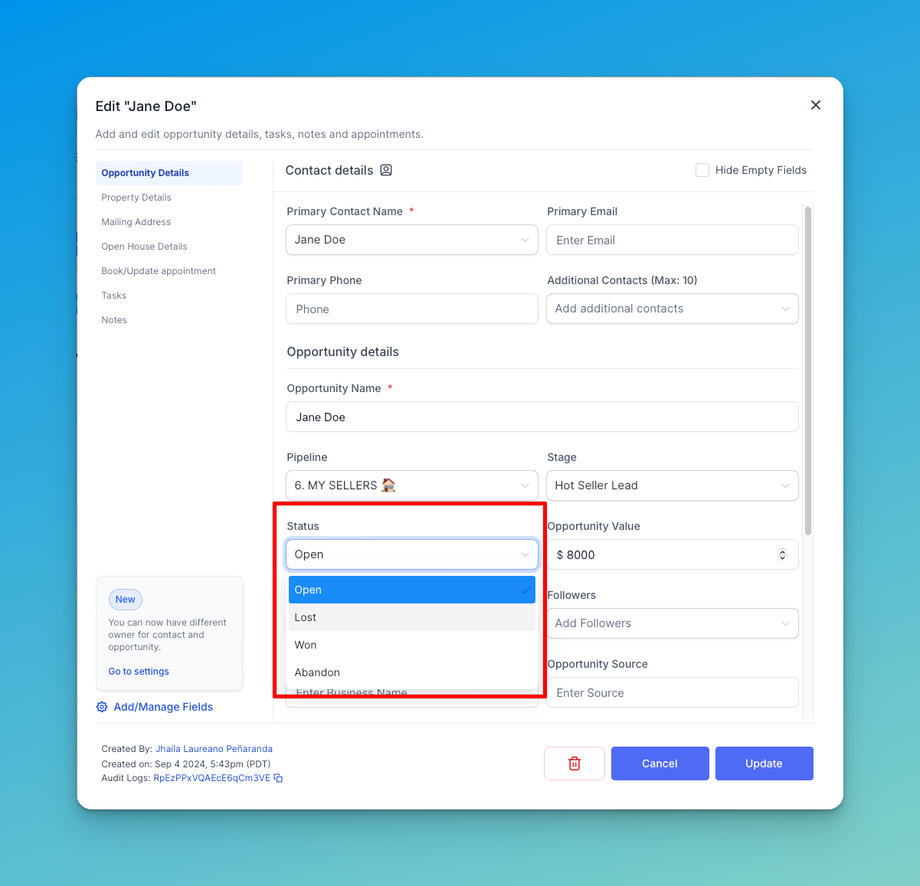 - Update any relevant details such as the contact's name, contact information, opportunity value, and opportunity source.