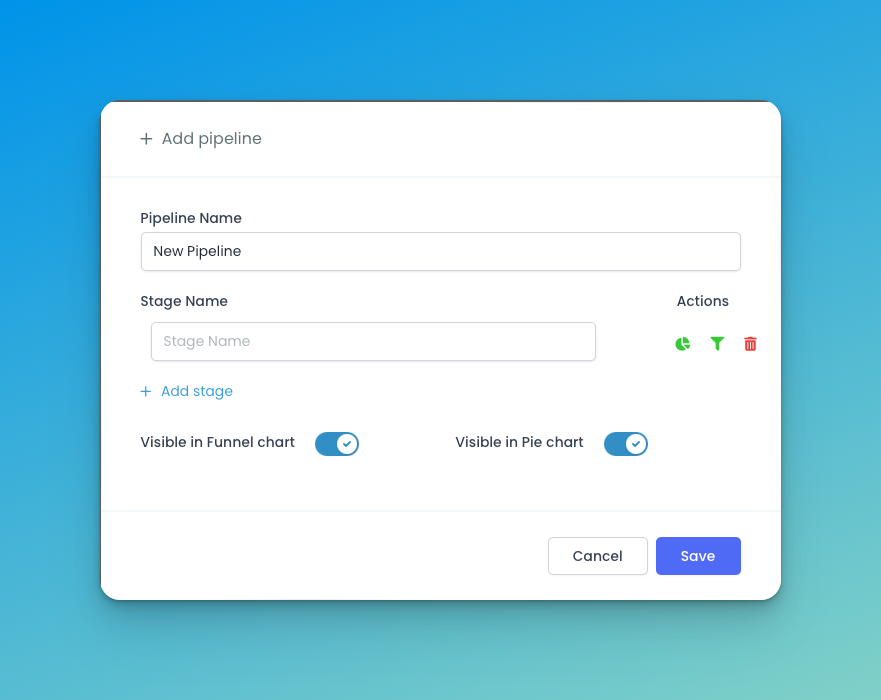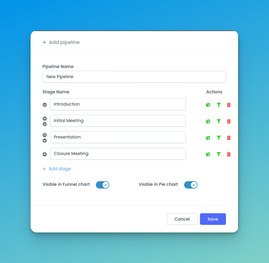 You can also configure whether or not to show each stage in the dashboard funnel and pie charts by clicking on their icons at the right of the respective stage.
