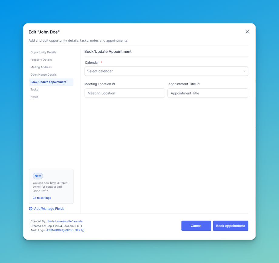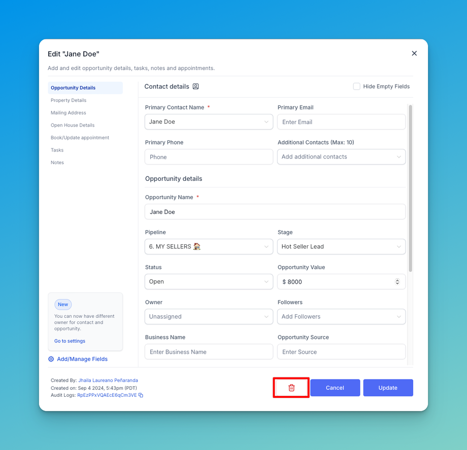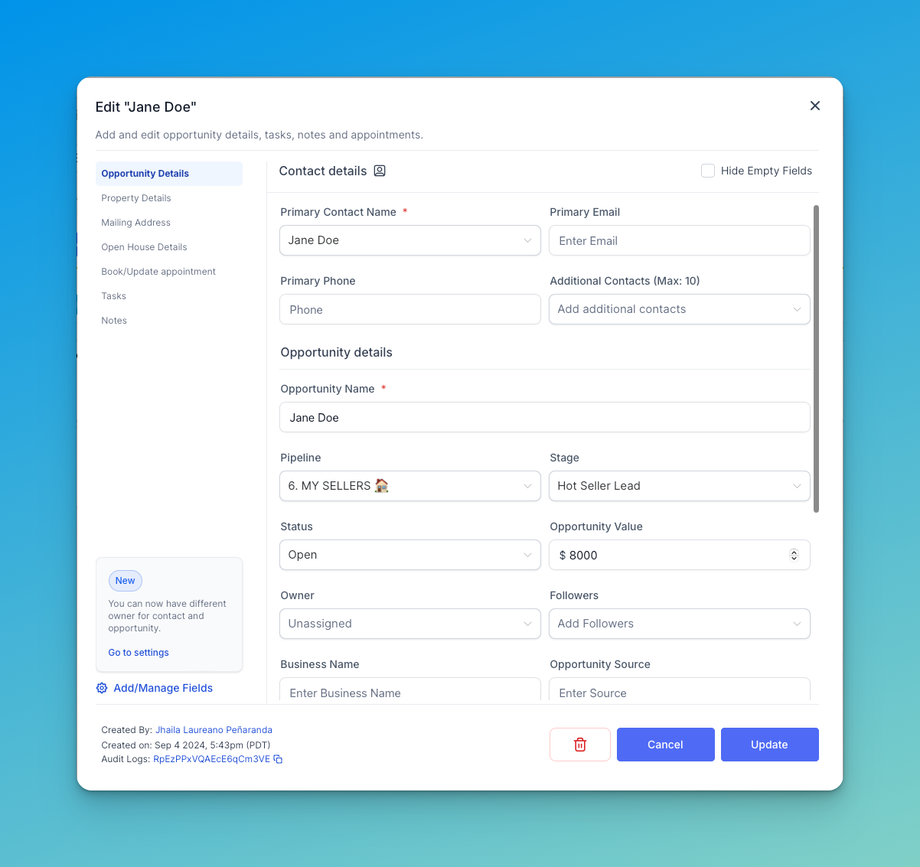 - You can also modify pipeline stages, owners, tags, or any other custom fields associated with the opportunity.