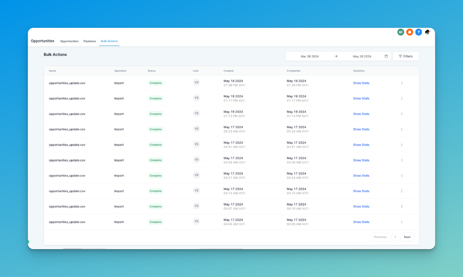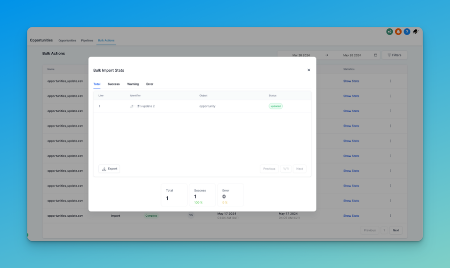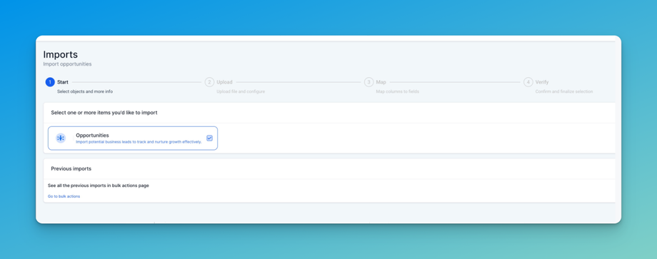 5. Monitor the Import: Check the import progress under Opportunities > Bulk Actions. If any errors occur, refer to the error messages provided for guidance on fixing them.