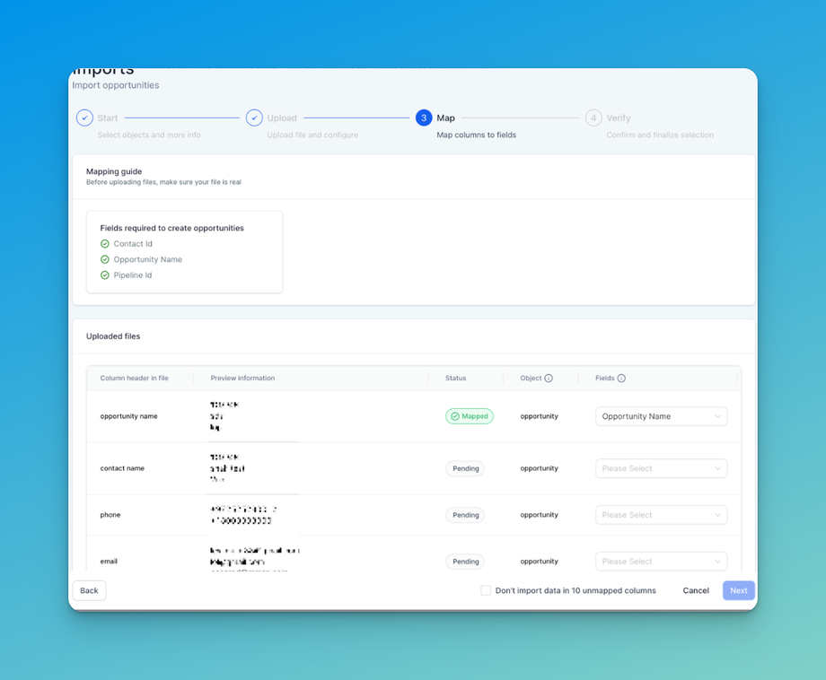 - If you decide to not import certain field, you can choose to keep it unmapped and check the box on the bottom to proceed. -"Please ensure all mandatory fields are mapped. To proceed, either map all fields or choose Don't import data for unmapped columns"