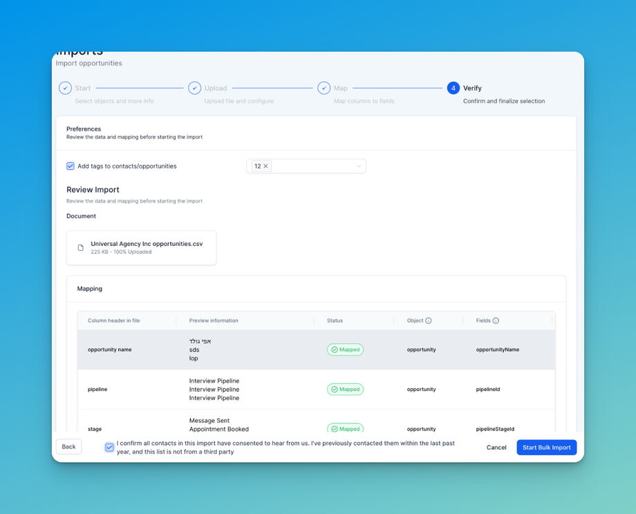 3. Map Your Fields: Ensure each column in your file is correctly mapped to the corresponding field in the system. Adjust the mappings if necessary.