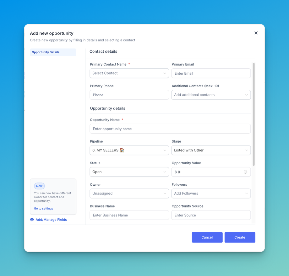 - Fill in the relevant details for the opportunity, such as the contact name / information, pipeline details and opportunity value.