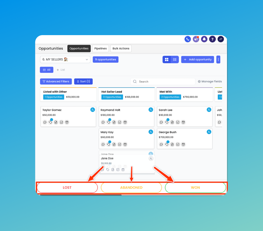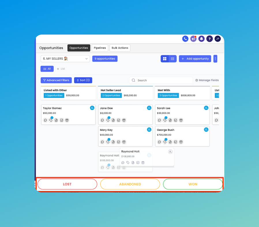 - Opportunities with the "Lost" status represent deals that have been unsuccessfully concluded.