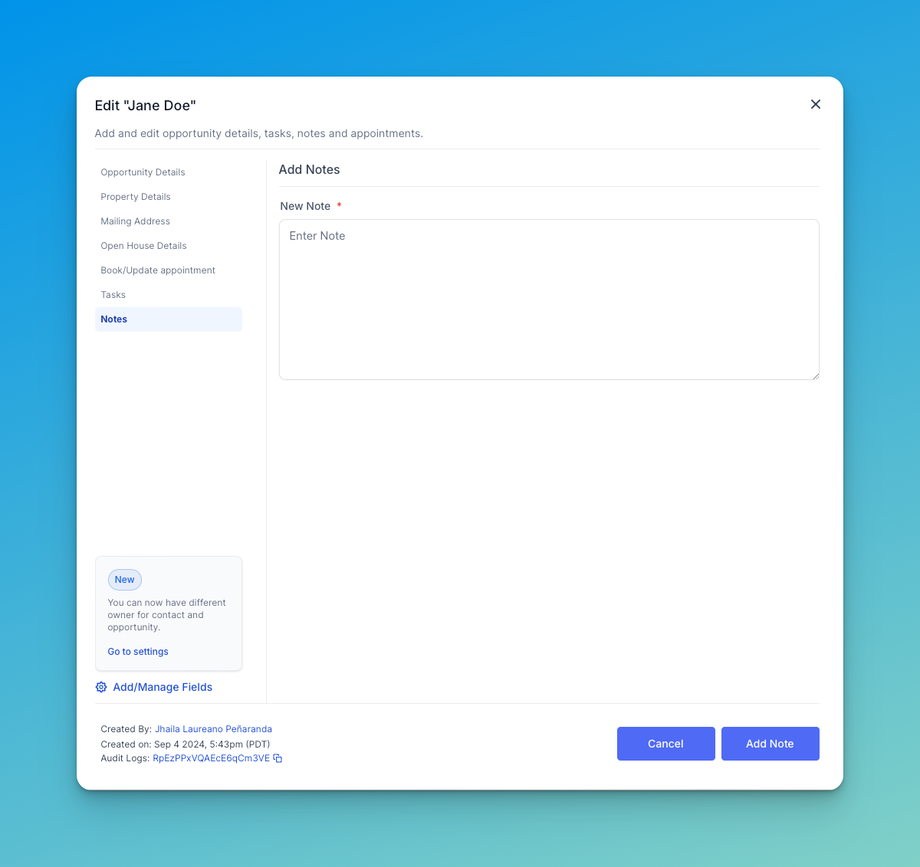 - If necessary, add new notes or additional information about the opportunity by clicking on the "Notes" option in the left sidebar.