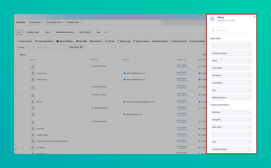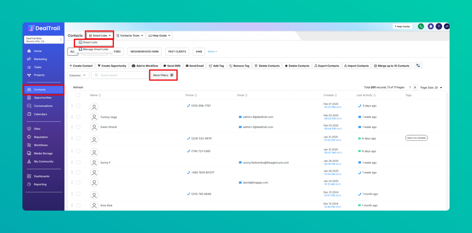 - Go to Contacts > Contacts/Smart Lists and hit "More Filters."