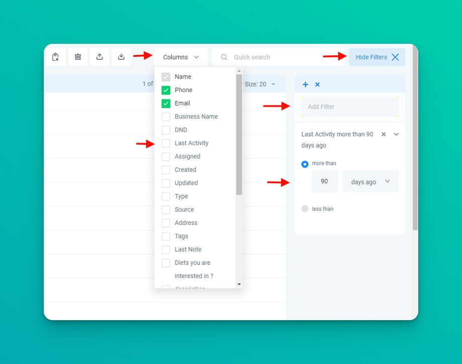 Select the last activity filter. Once it is added. Click the 'More Than' radio button. Type in 90 days.