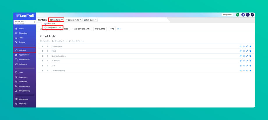 - You can manage your Smart Lists by navigating to "Manage Smart Lists" at the top right of the Contacts page. This area lets you duplicate, share, rename, or erase a Smart List using the icons to the right.