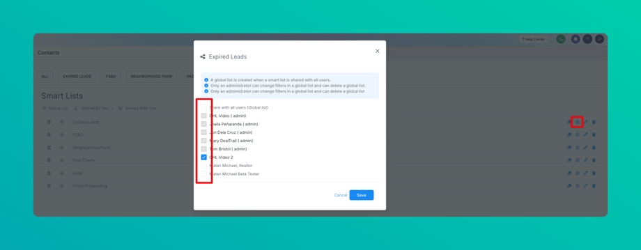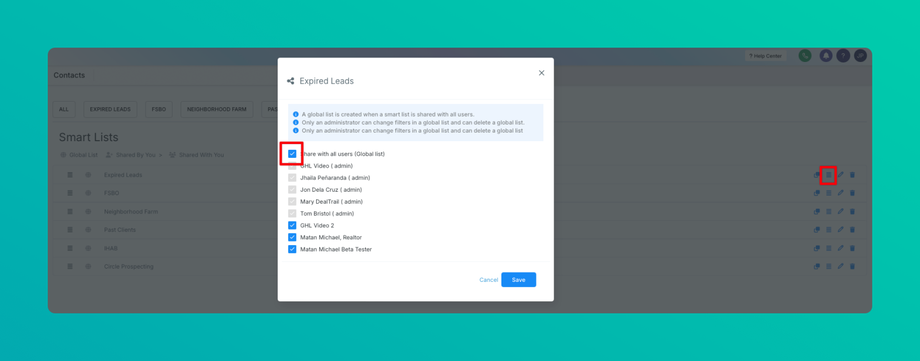 A: Yes, you can share Smart Lists. Go to 'Manage Smart Lists' and click the 'share' button to do this.