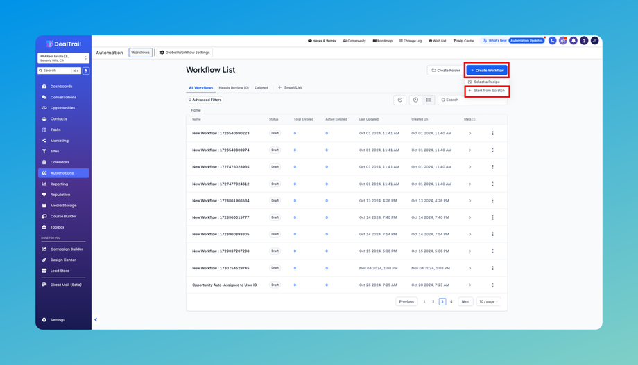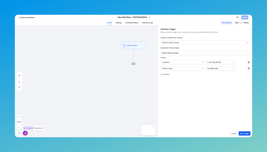 This workflow setup allows users to be notified and assigned manual actions when a lead enters a specific stage in the pipeline. Make sure to save and publish your workflow before expecting it to function.