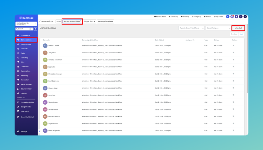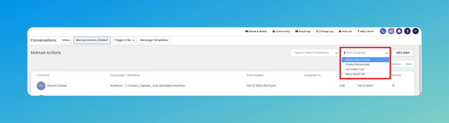 • Once the workflow is active, go to the Conversations section. Under Manual Actions (Dialer), you will see the leads that have been assigned to a user for follow-up.