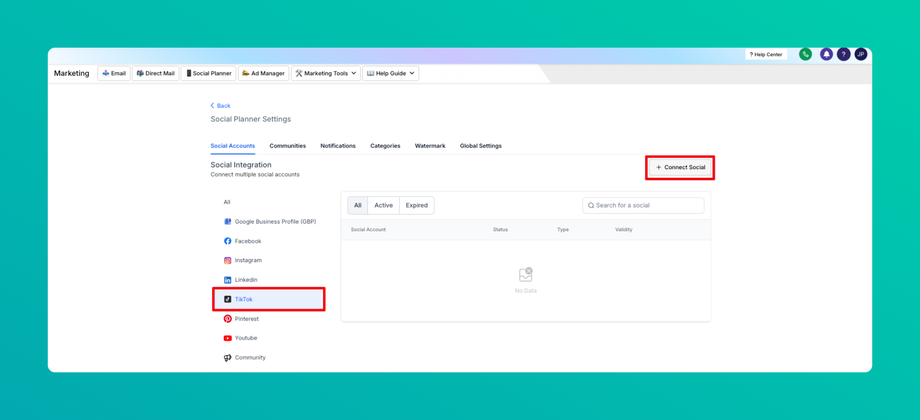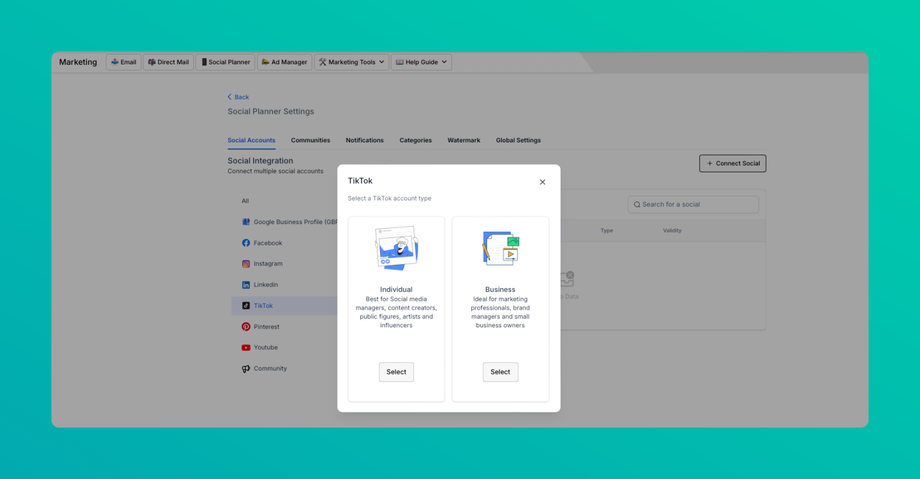 Step 3: After clicking Connect Social, there will be an option to add the TikTok Personal and Business Account