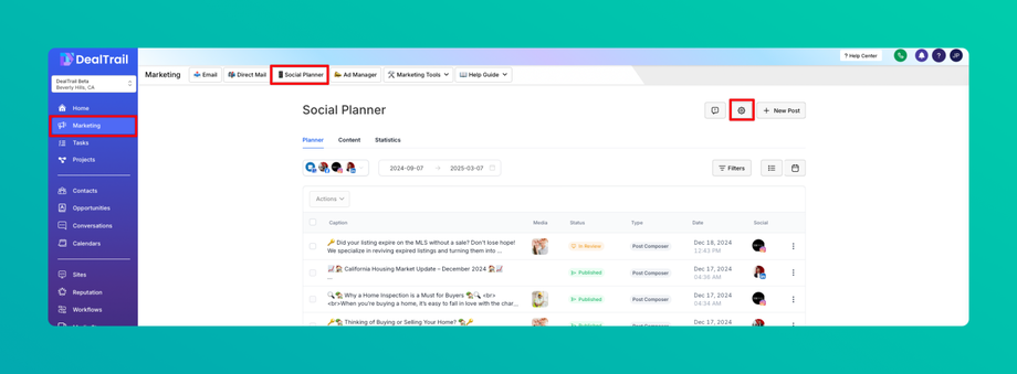 To get started, please go to Social Planner. In the top right corner of Social Planner, there is a Setting option (Gear icon). Please navigate to Settings by clicking it.