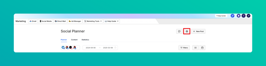 Step 2: On Visiting Social Media, there will be a wizard with connect option, or after visiting the overview of Social Media will have a Setting option (gear icon)