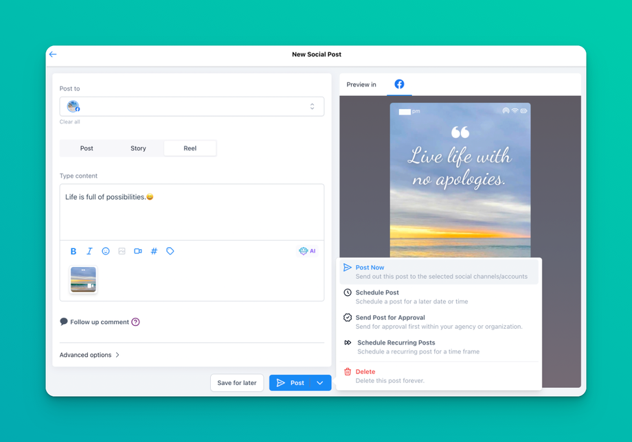 This Knowledge Base article introduces Facebook Reels in Social Planner, allowing users to create and schedule short-form videos for their Facebook Pages. It provides step-by-step instructions on connecting a Facebook account, creating a new post, and uploading a Reel, along with key specifications such as file size, duration, and format. Note that Facebook Reels are currently available only for Pages, not Groups, and do not support custom thumbnails.
