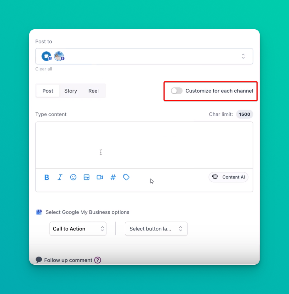 - By toggling this on, you can create unique content for each platform, considering their individual character limitations.