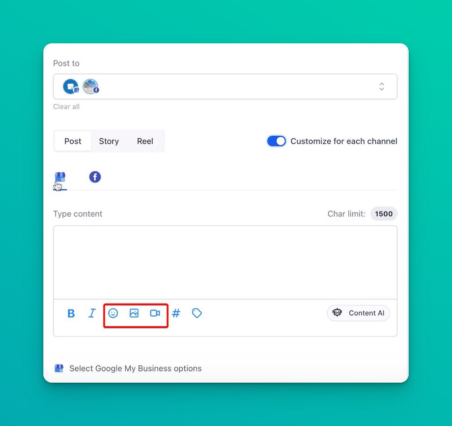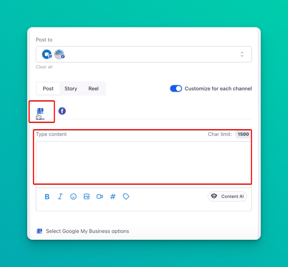 - Choose to Customize for Each Channel: To get the customization option to appear, you need to select multiple social media channels, such as Facebook, Instagram, Twitter, LinkedIn, GMB (Google My Business), etc.