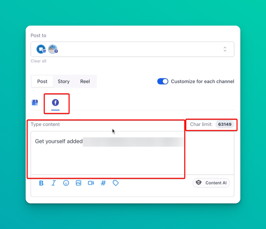 You can view and edit the content for different channels separately, ensuring that each post aligns with the platform's character limit and audience preferences.