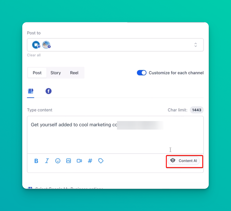 Example: They could use the "Customize for Each Post" feature to create channel-specific posts, summarizing the blog on LinkedIn with a professional tone, crafting an engaging teaser on Twitter, and a visual infographic post on Instagram.