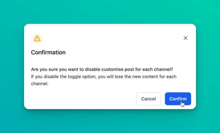 Please Note: If you turn off the customization toggle, the active social content will apply to all the social channels selected, and there will be a warning that customized content will be lost.