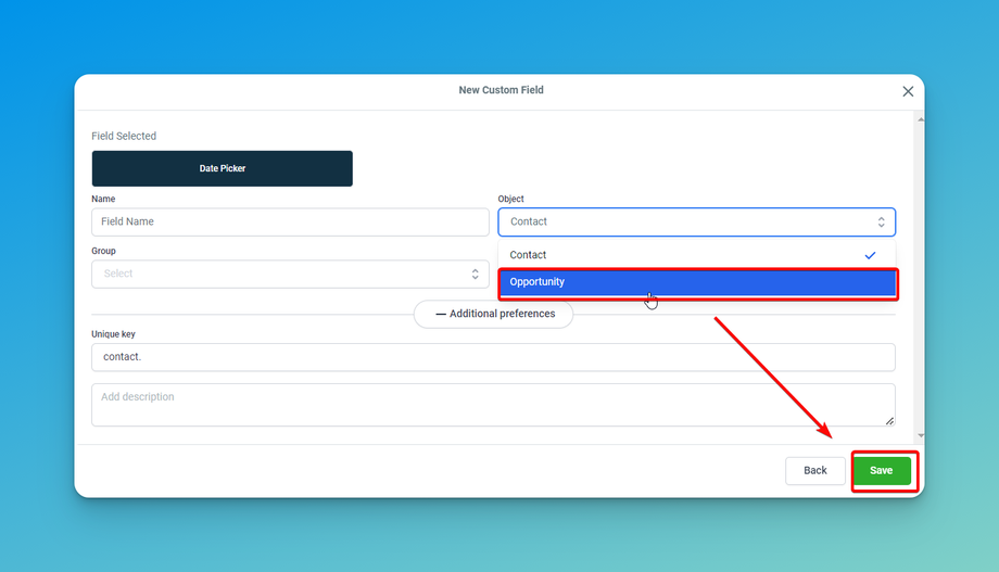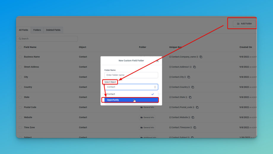 Create Custom Folders: You can group your custom fields for opportunities into custom folders. This helps you categorize and organize your fields better. To do this, go to 'Folders' in the 'Custom Fields' section, create a new folder, give it a name, and select 'Opportunity' as its object.Use Your Custom Fields: When you go to the 'Opportunities' section when creating or editing an opportunity, you will see these new custom fields. You can fill in the information as needed.