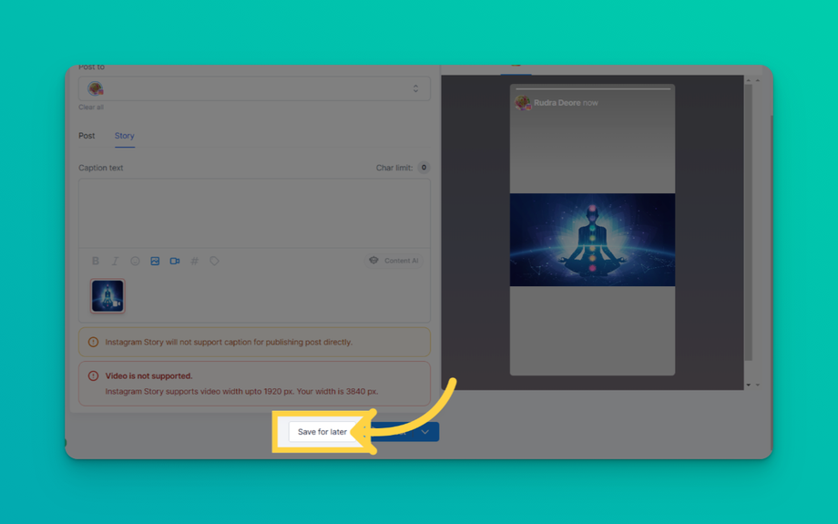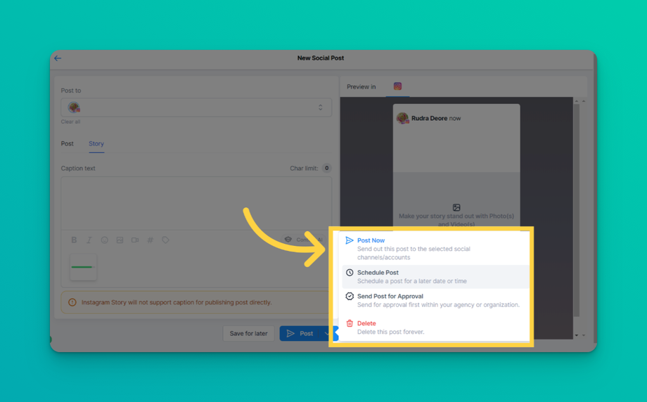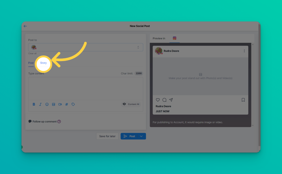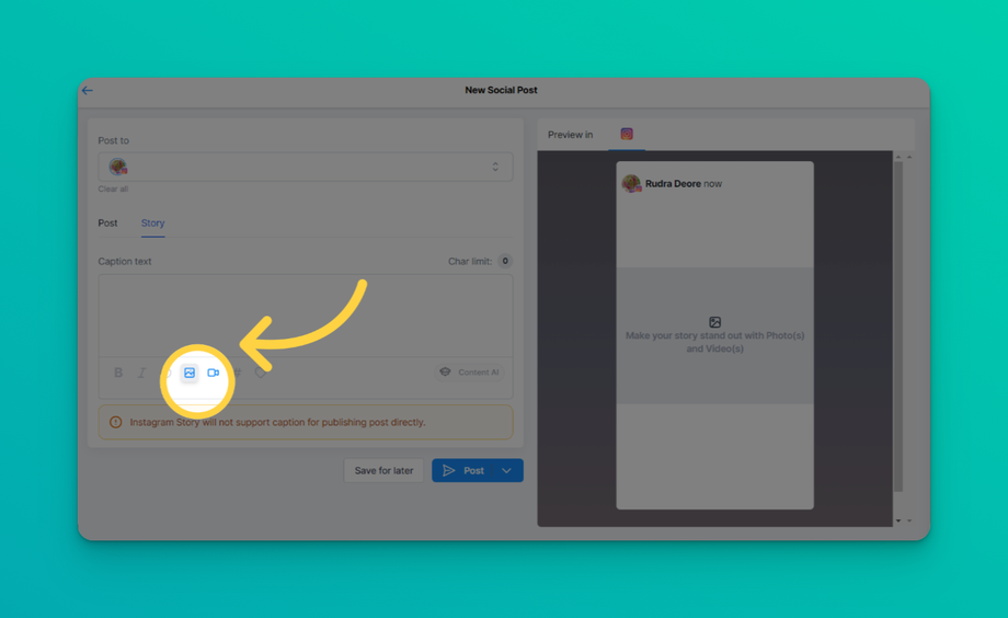 This feature caters specifically to Instagram Professional accounts, providing the ability to create and schedule content directly through Social Media. Whether you're looking to post immediately or pre-plan your story posts, this tool offers the flexibility you need.