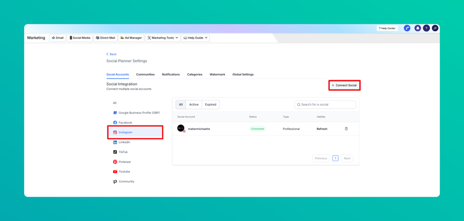 - Now, your Instagram business profile is linked to your Facebook account. If you'd like to integrate your Instagram Business Profile with Marketing > Social Media > Settings