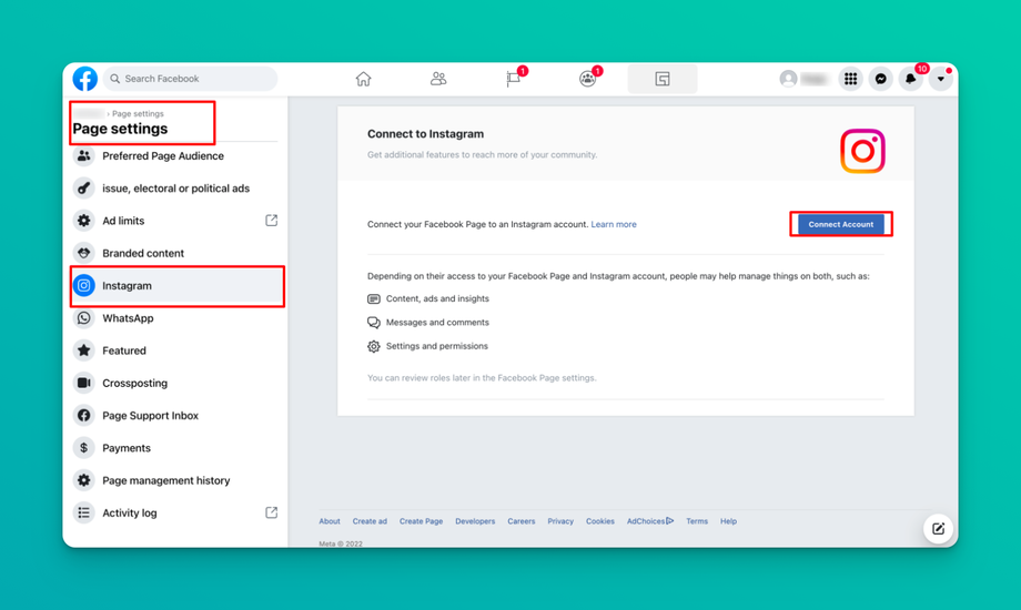 - Select Instagram from the Page settings menu. And Connect Instagram Business account.